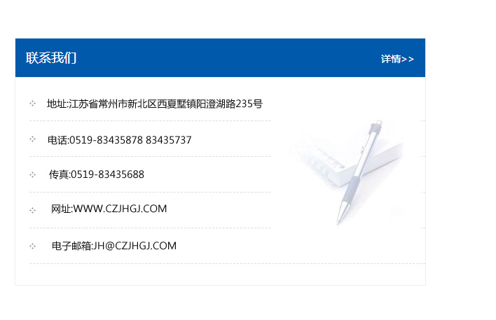 地址:常州市新北區友邦商務大廈1幢16、17層  電話:0519-85101652  傳真:0519-85112595  郵編:213022  網址:www.cz-jiayue_cn.fhxjj.com  郵箱:xiajifengaa@163.com